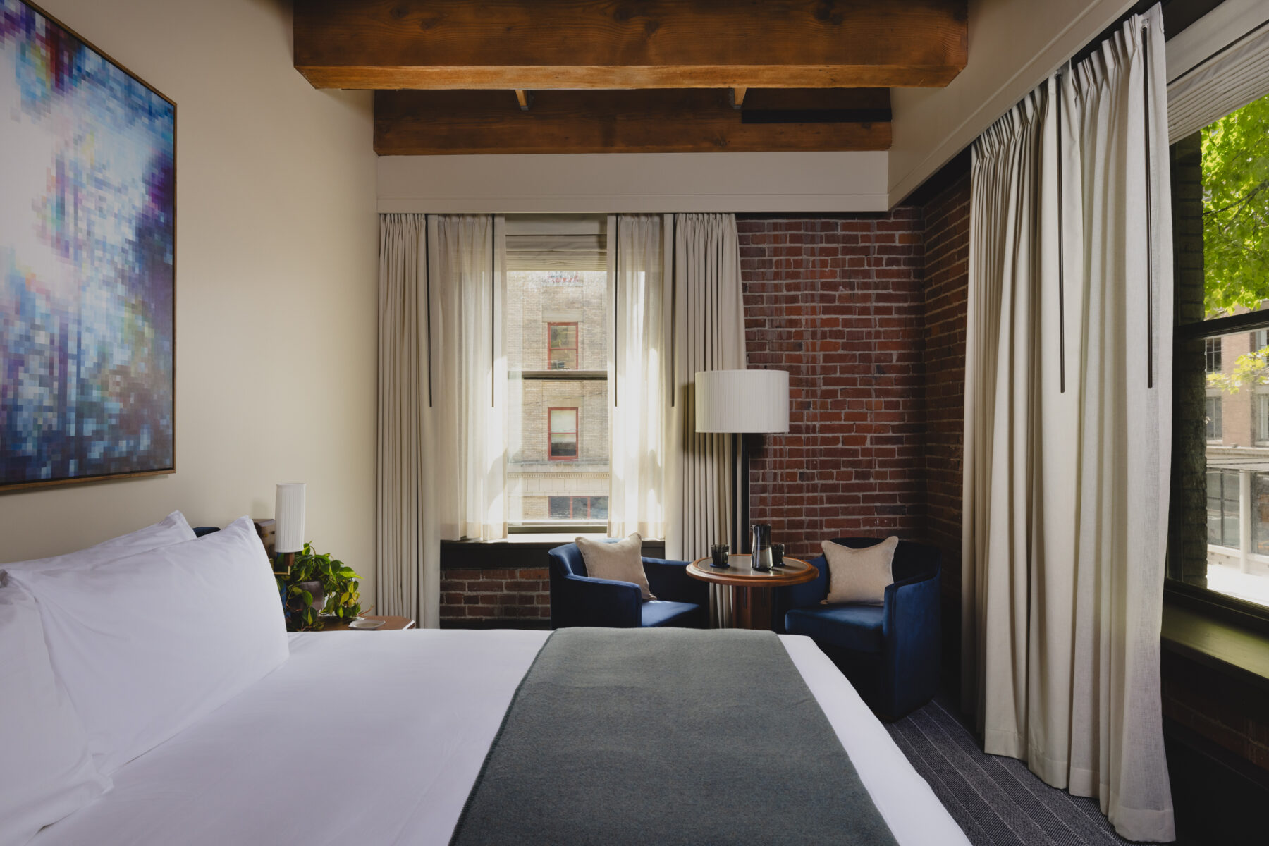 Perched at the crossroads of 1st Avenue and the Railspur District, the Cedar Corner King offers a uniquely immersive stay in Seattle’s most historic neighborhood. Two expansive windows frame sweeping views of Pioneer Square, filling the room with natural light and a connection to the city’s energy. Designed for relaxation and function, the space features a plush king bed, a cozy corner seating area, and a dedicated workspace. Rich textures and refined details celebrate the building’s heritage, while modern amenities enhance the experience with thoughtful comfort.